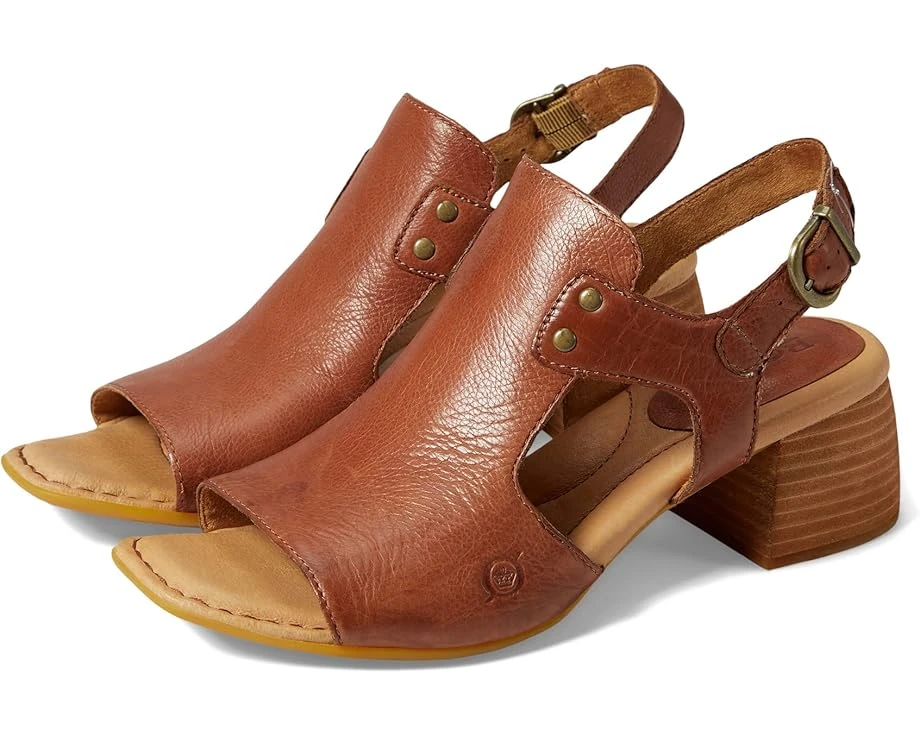 SKU: #9842744Soft hand-finished leather upper. Breathable soft fabric suede lining.Leather covered cushioned footbed with extra foam for added comfort.Adjustable buckled sling strap strap closure.Block heel. Brand name embossed on the footbed. Open square toe design. High-traction flexible lightweight rubber outsole.Imported. Product measurements were taken using size 9, width M (B). Please note that measurements may vary by size.Measurements: